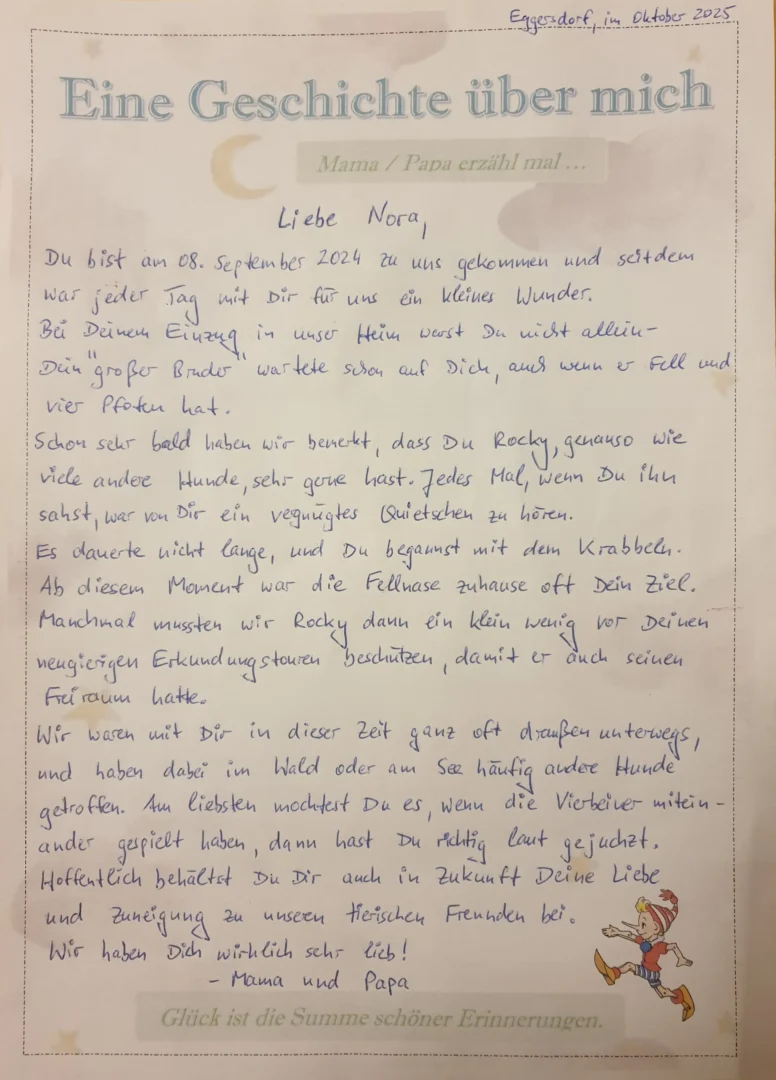 El procedimiento de adopción de nuestra hija por su madre biológica, mi esposa Franziska, finalmente tomó aproximadamente un año completo. Durante este tiempo, tuvimos que rellenar muchos documentos. Tuvimos que indicar, entre otras cosas, por qué queríamos adoptar a Nora, qué tan grande es nuestro hogar, cuánto ganamos, cómo se ve nuestro árbol genealógico, qué hemos hecho en nuestras vidas hasta ahora, y muchas otras cosas.